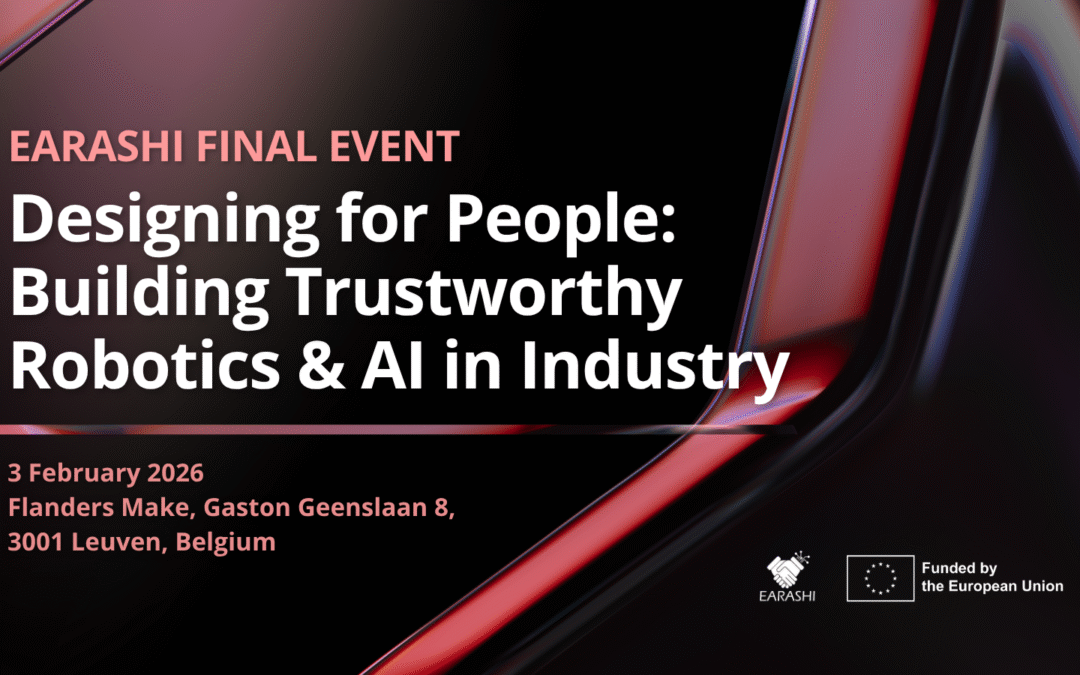 As EARASHI enters its final months, we are thrilled to announce our closing event on February 3, 2026, in Leuven (BE), hosted at the Flanders Make premises. Titled “Designing for People: Building Trustworthy Robotics & AI in Industry”, the event will bring together researchers, industry experts, and pilot teams to showcase live technical demonstrations, digital showcases, and an interactive roundtable. Attendees will see firsthand how EARASHI’s innovations and Human-Centered Design principles have converged to create trustworthy, ethical, and user-friendly robotics and AI systems for the factories of the future.